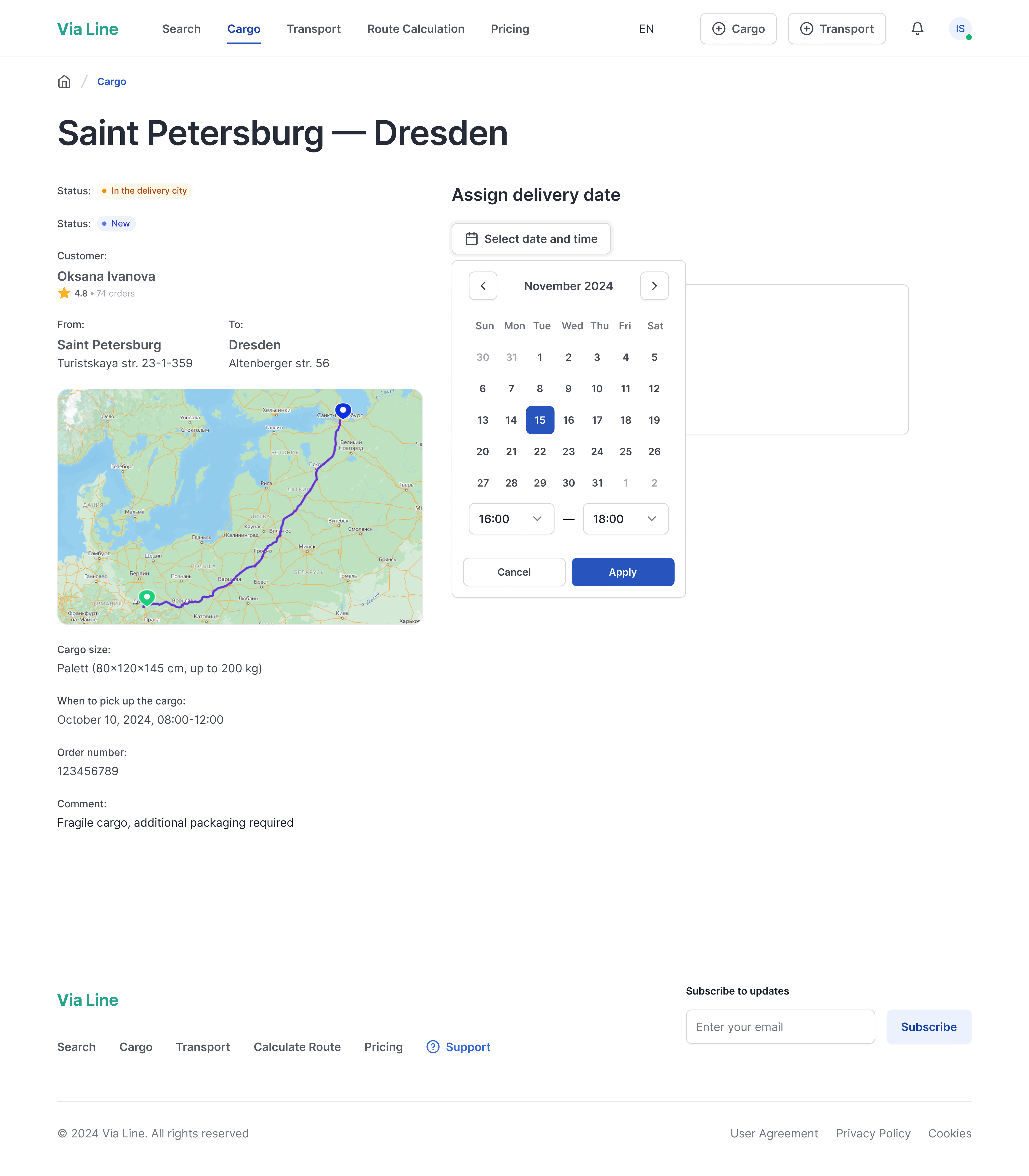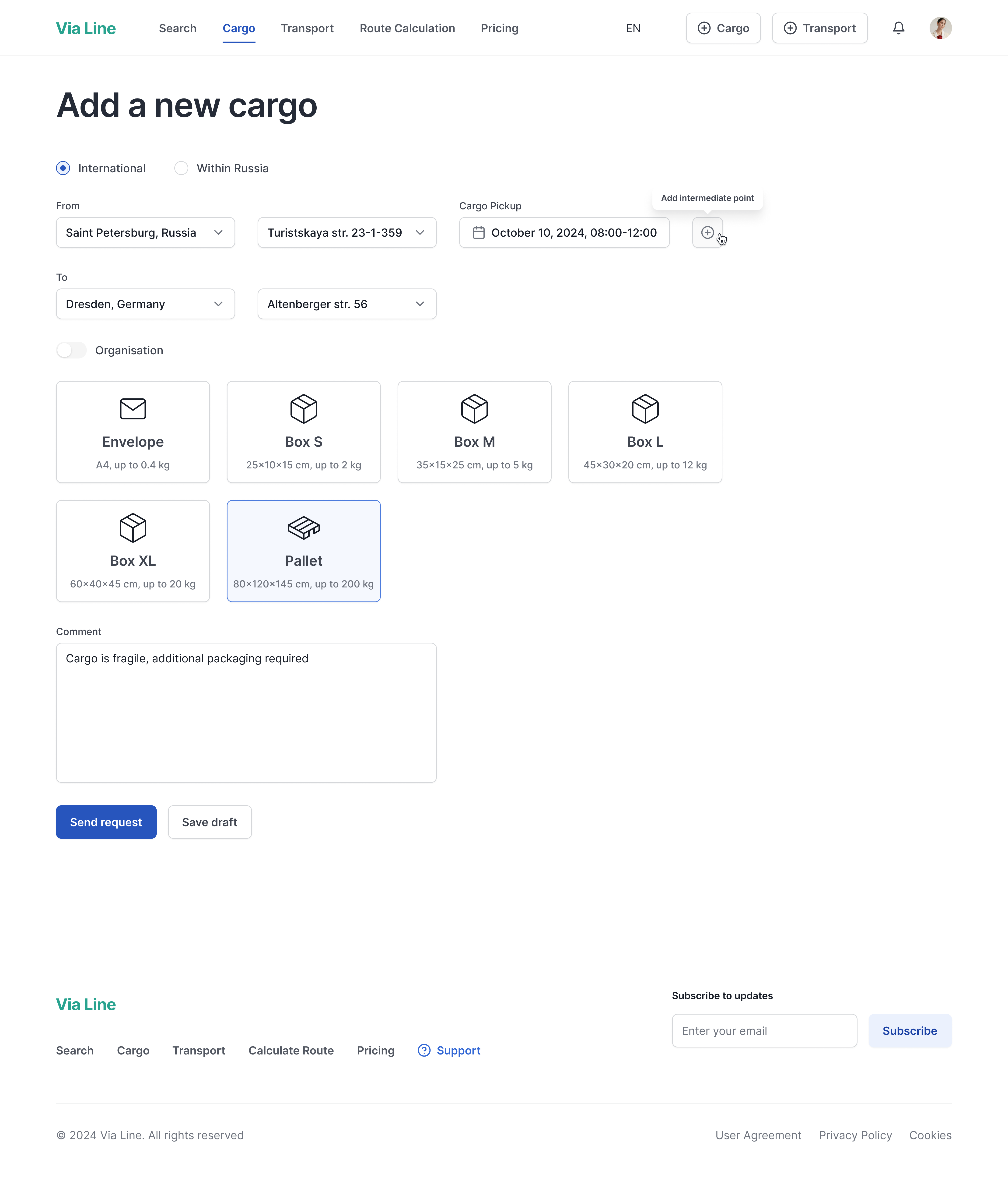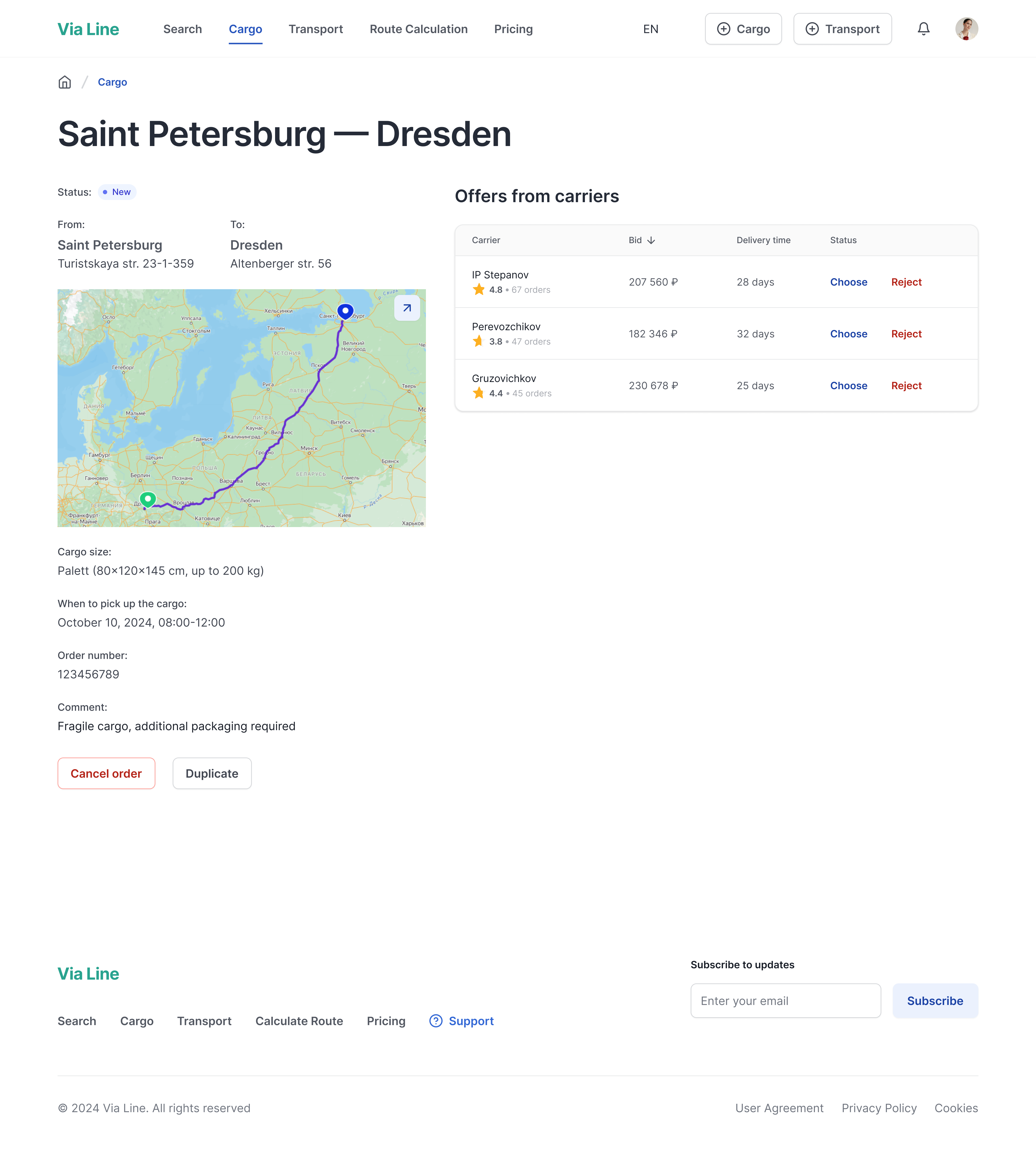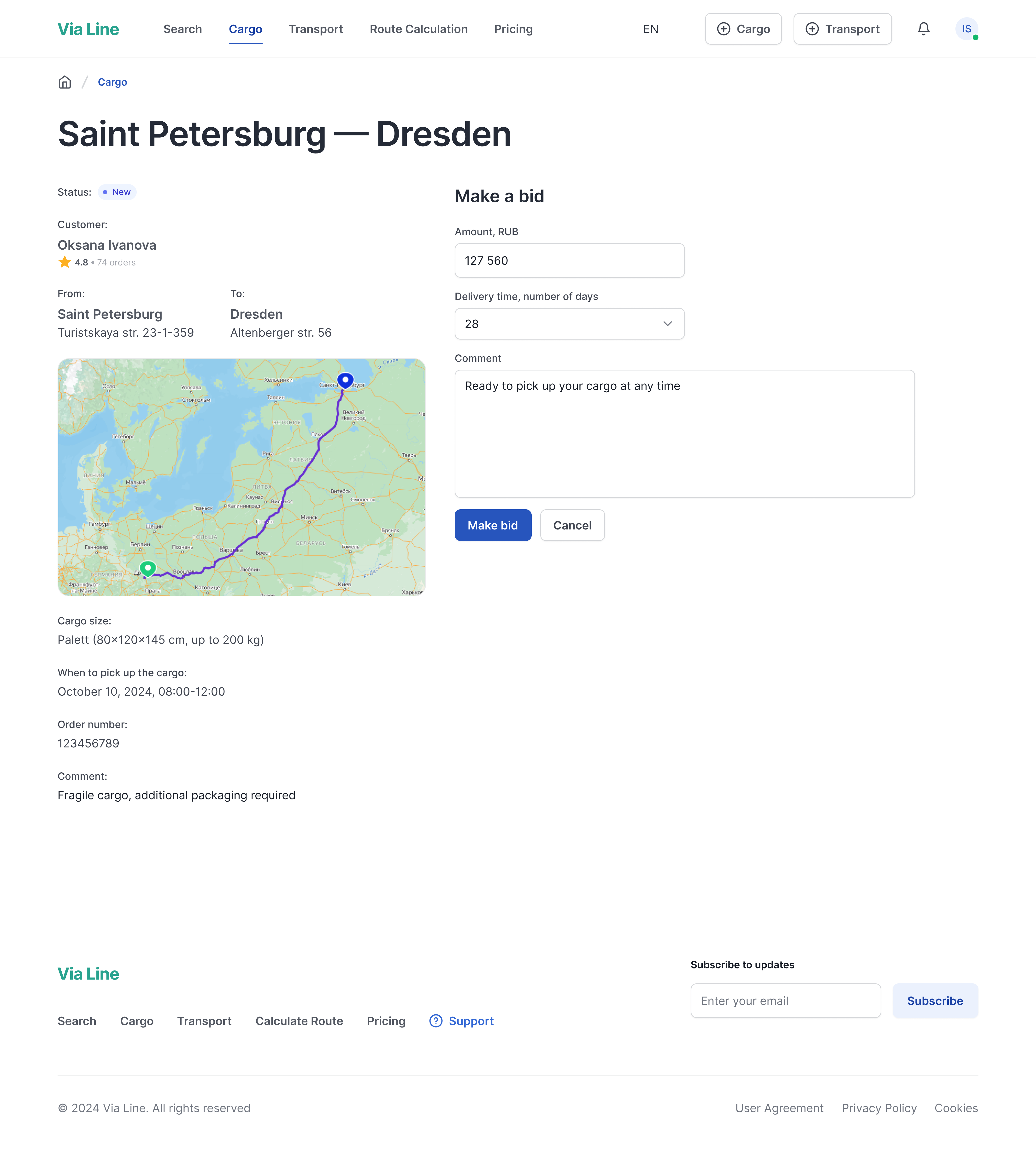 Das Projekt optimiert den Prozess der Suche und Buchung von Frachttransporten, hilft Kunden, geeignete Transportmöglichkeiten zu finden und ermöglicht die Auswahl von Spediteuren nach Bewertungen und anderen Kriterien. Spediteure haben Zugang zu einer Auftragsdatenbank und können Routen sowie Fahrzeugauslastung planen. Transporte werden sowohl im Inland als auch international durchgeführt. Der Schwerpunkt liegt auf Lieferungen von Russland nach Europa, da es aufgrund von Zollschwierigkeiten und Sanktionen nicht viele Angebote in diesem Bereich gibt. Die Plattform bietet Spediteuren Unterstützung beim Erhalt der erforderlichen Dokumente und Genehmigungen für den Gütertransport.