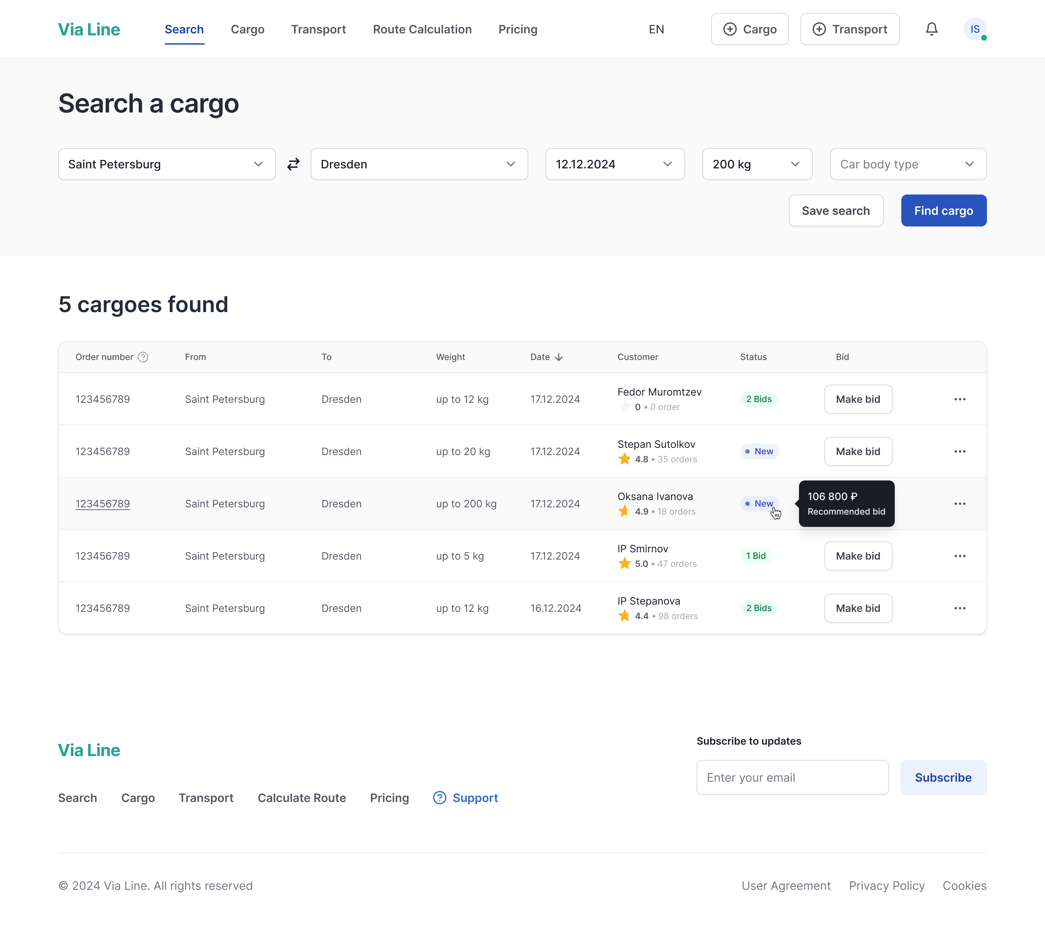 Frachtsuche. Der veröffentlichte Auftrag erscheint in der Liste anderer Aufträge. Der Spediteur kann sein Angebot abgeben. Die Plattform analysiert die Größe der Fracht und die Entfernung und schlägt einen durchschnittlichen Preis für den Transport vor.