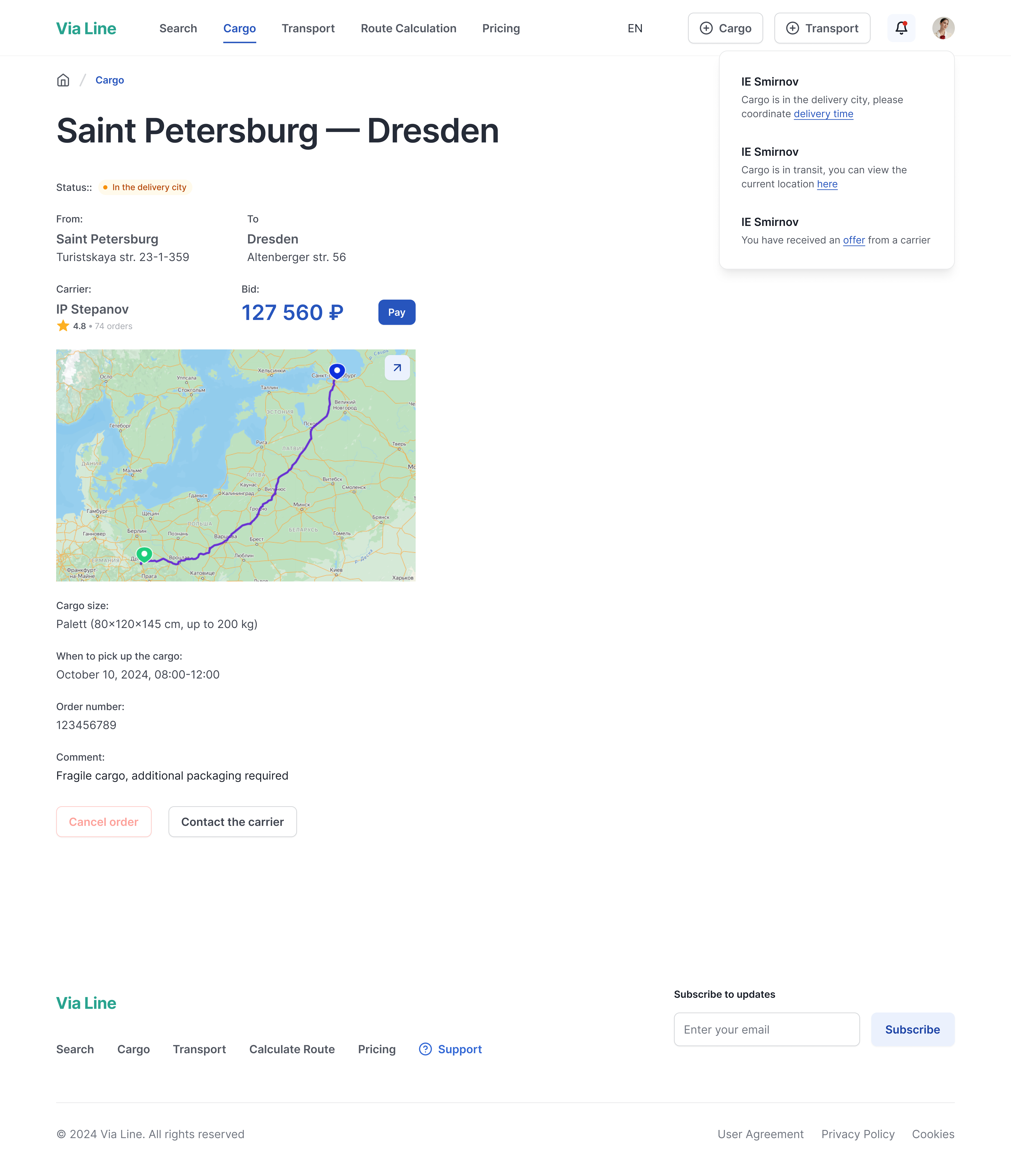 Bezahlung der Fracht. Der Auftraggeber kann den Transport in jeder Phase der Lieferung und sogar bis zu 5 Werktage nach der Lieferung bezahlen. Informationen zum Auftragsstatus werden per E-Mail und über die Plattform gesendet. Im Benutzerkonto können verschiedene Benachrichtigungsoptionen eingestellt werden.